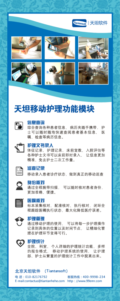 天坦移動(dòng)護(hù)理系統(tǒng)提供全面的護(hù)理服務(wù)。系統(tǒng)以整體護(hù)理為核心,將各類移動(dòng)終端與護(hù)理業(yè)務(wù)流程相結(jié)合,護(hù)士利用系統(tǒng)內(nèi)完善的護(hù)理計(jì)劃、護(hù)理評估、健康教育等功能為病人提供更全面的服務(wù)。